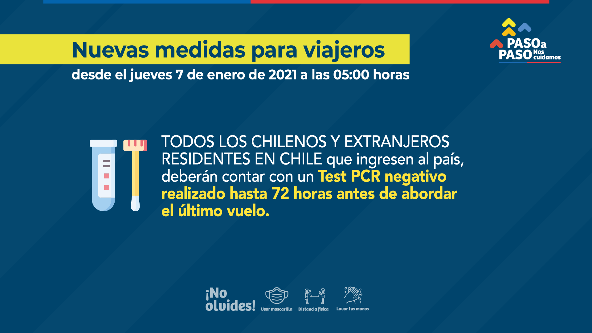 De esta manera, partir de este jueves 7 de enero, a las 05:00 horas, todos los chilenos y extranjeros residentes que deseen entrar al país, deberán tener un PCR negativo tomado hasta 72 horas antes de realizar el viaje a suelo nacional.