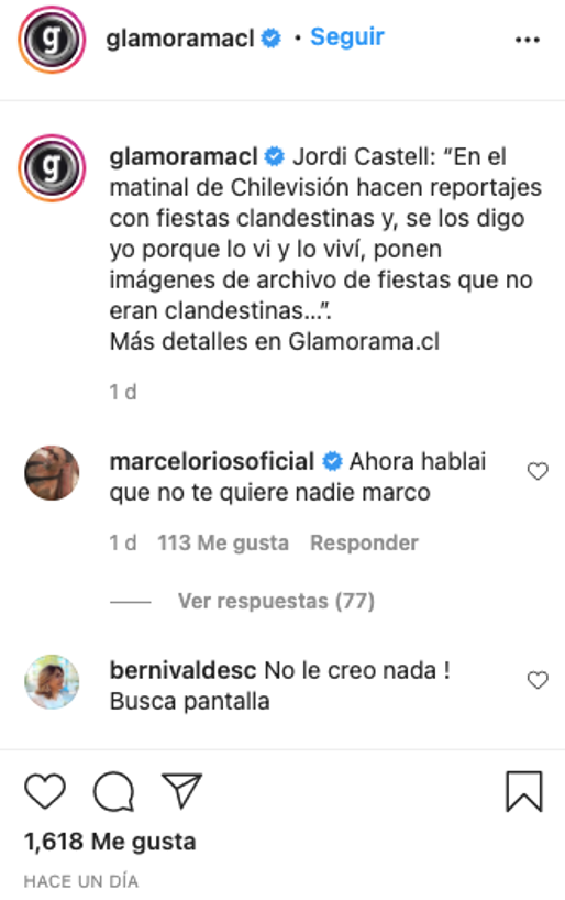 En este contexto el «Chino» comentó en Instagram una publicación del sitio de espectáculos Glamorama que se relacionaba con el conductor, quien hace algunos días, y a propósito de la bullada reunión clandestina en Cachagua indicó que “es tan, tan evidente la decadencia de personas que viven en guetos, sobre todo la clase alta tan poco empática con la actualidad y a la vez tan descarada con estar diciendo las cosas de esa forma y con esa liviandad”.