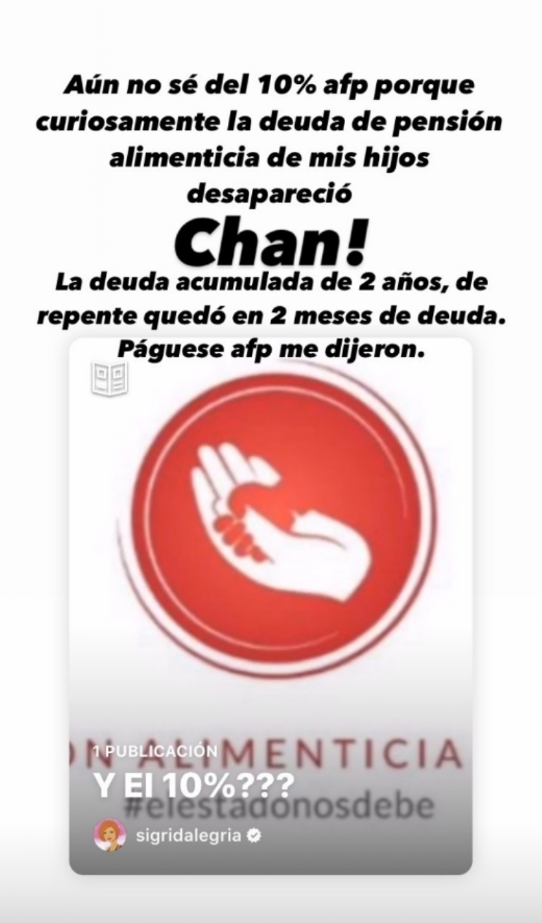“Aún no sé del 10% AFP, porque curiosamente la deuda de pensión alimenticia de mis hijos desapareció“, dijo, agregando que “la deuda acumulada de dos años, de repente quedó en 2 meses de deuda”.