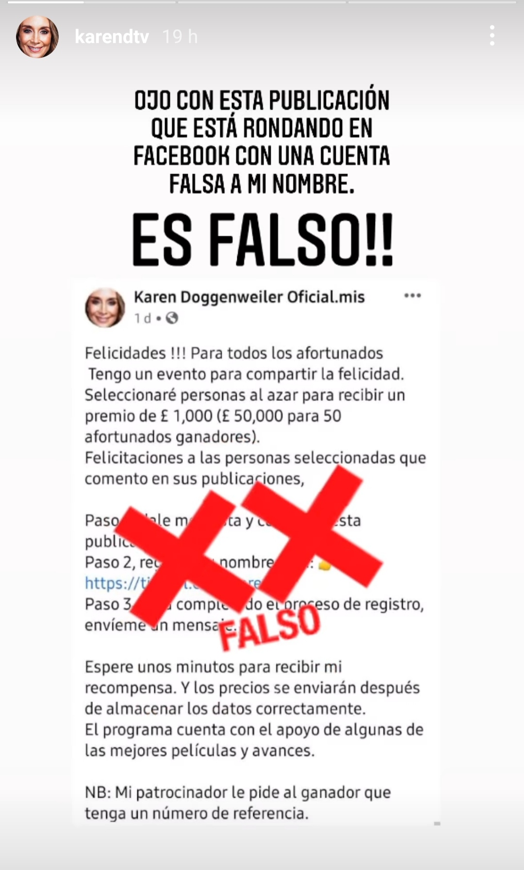 Karen Doggenweiler recientemente alertó a sus seguidores en redes sociales.Esto porque hay una cuenta falsa haciéndose pasar por ella