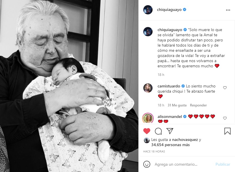 La locutora de Radio Corazón decidió compartir una fotografía de su progenitor junto a su pequeña hija Amal, acompañado de un emocionante texto. «Solo muere lo que se olvida, lamento que la Amal te haya podido disfrutar tan poco», inició Chiqui Aguayo.