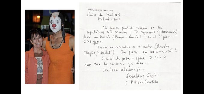 A través de su cuenta de Twitter el artista reveló que recibió una emocionante carta por parte de la hija de Charles Chaplin. Esto luego de ver su trabajo en Madrid. Y según escribió, su presentación le hizo recordar a si difunto padre.