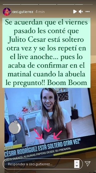 «Se acuerdan que el viernes pasado les conté que Julito César está soltero otra vez, y se los repetí en el live anoche. Pues lo acaba de confirmar en el matinal cuando la abuela le preguntó», comentó la periodista de Zona de Estrellas.