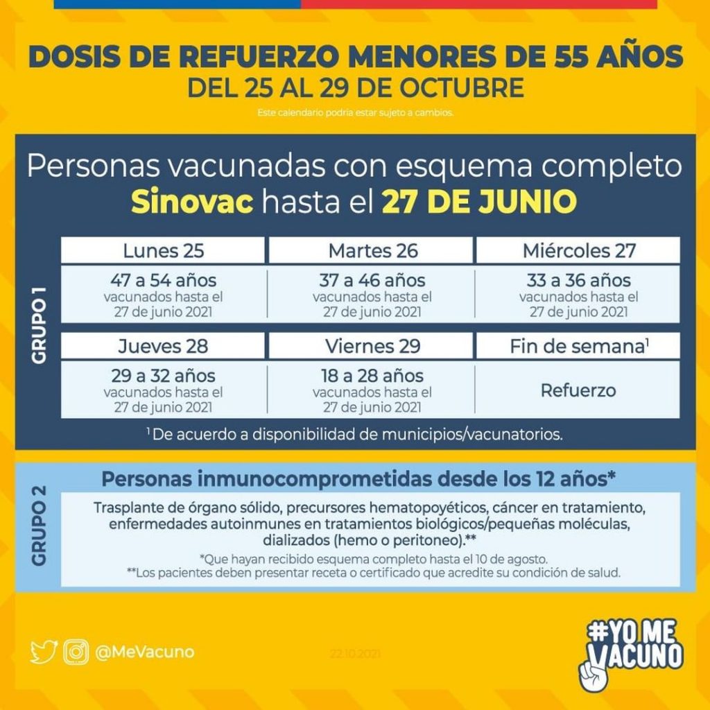 - Lunes 25: Personas entre 47 a 54 años (vacunados con Sinovac hasta el 27 de junio). También, personas inmunocomprometidas desde los 16 años (trasplante de órgano solido, precursores hematopoyéticos, cáncer en tratamiento). Que hayan recibido esquema completo hasta el 10 de agosto.