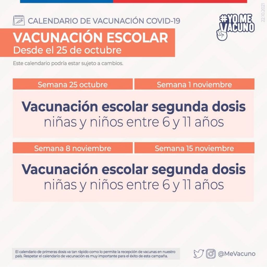 Para los menores de edad el calendario de vacunación escolar está distribuido desde la semana del 25 de octubre a la del 15 de noviembre para segundas dosis. Aunque está sujeto a cambios.