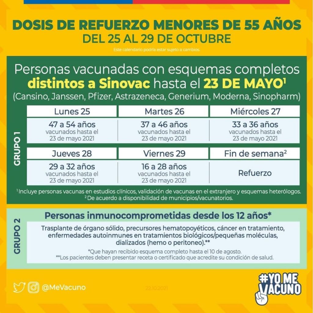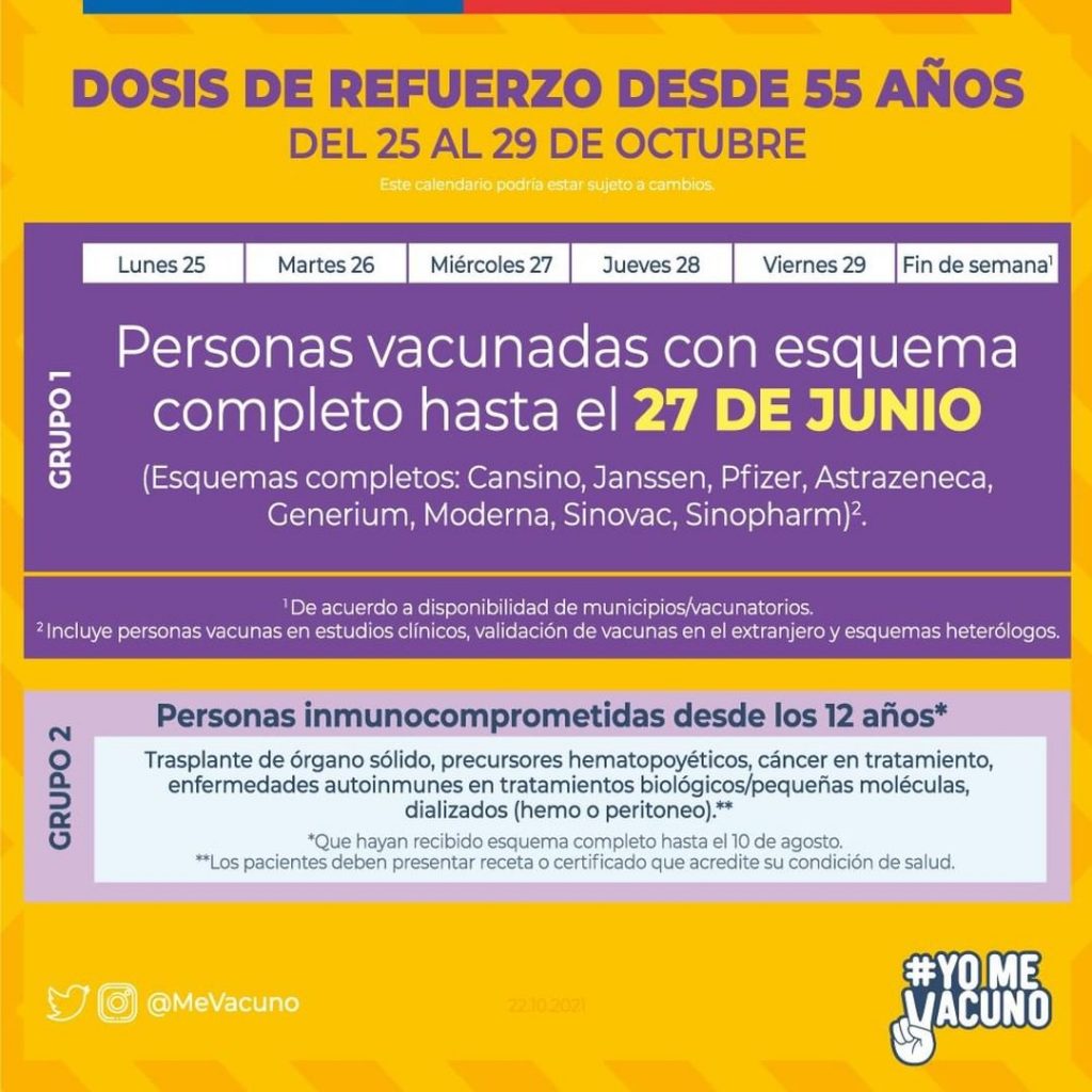 Para esta semana el calendario de vacunación estará enfocado en la dosis de refuerzo. Especialmente para aquellos que recibieron la vacuna de Sinovac. Pero a partir de este martes 12 de octubre se incluyen todos los otros tipos de laboratorios con los cuales fueron vacunados los chilenos Cansino; Janssen; Pzifer; Astrazeneca; Generium; Moderna y Sinopharm.