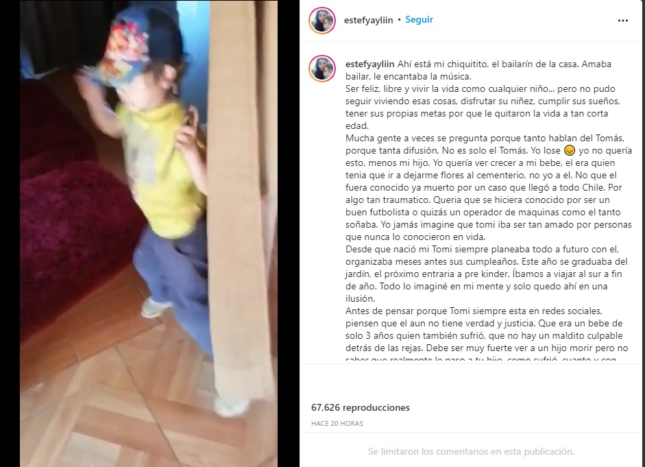 Asimismo, explicó que «antes de pensar por qué Tomi siempre esté en redes sociales, piensen que el aún no tiene verdad y justicia. Que era un bebé de solo 3 años que también sufrió, que no hay un maldito culpable detrás de las rejas. Debe ser muy fuerte ver a un hijo morir, pero no saber realmente qué le pasó a tu hijo, cómo sufrió, cuánto y con quién estuvo, créanme también es un dolor horrible».