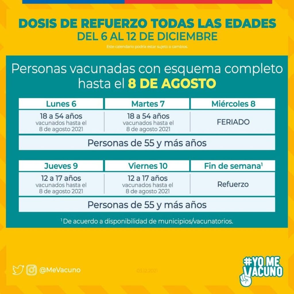 Para esta semana el calendario de vacunación estará enfocado en la dosis de refuerzo. Especialmente para aquellos que recibieron la vacuna de Sinovac, pero a partir de este martes 12 de octubre de 2021 se incluyeron todos los otros tipos de laboratorios con los cuales fueron vacunados los chilenos Cansino; Janssen; Pzifer; Astrazeneca; Generium; Moderna y Sinophar.
