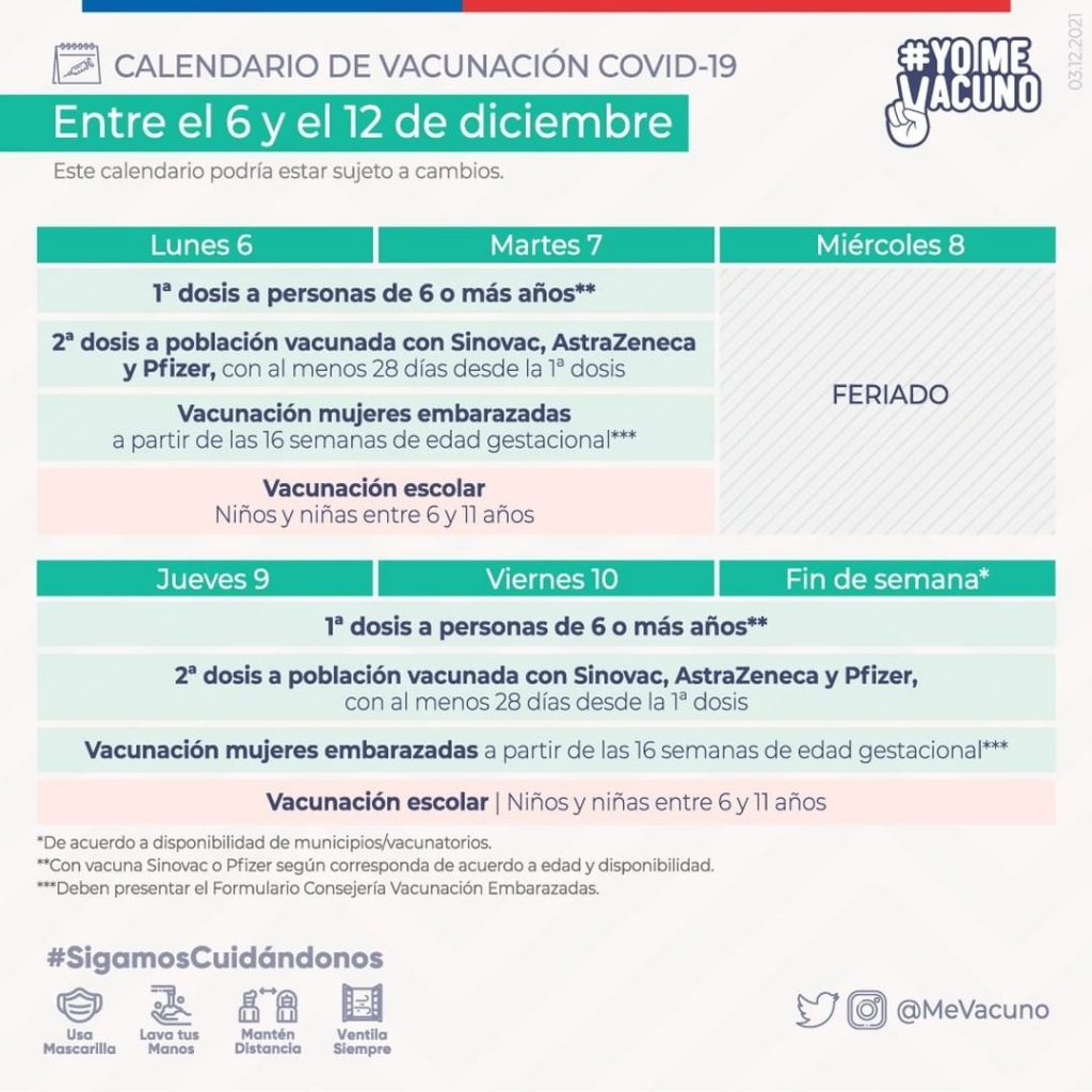 - Martes 07: 1era dosis a personas de 6 o más años / 2da dosis a población vacunada con Sinovac, AstraZeneca y Pfizer, con el menos 28 días desde la 1era dosis / Vacunación mujeres embarazadas a partir de las 16 semanas de edad gestacional / Vacunación escolar niños y niñas entre 6 y 11 años.
