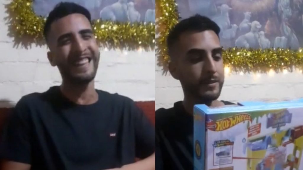Al ritmo del villancico «¡Navidad, Navidad, Hoy es Navidad!» el joven comenzó a abrir su regalo; la acción fue acompañada por una risa genuina ante la sorpresa del regalo que estaba abriendo.