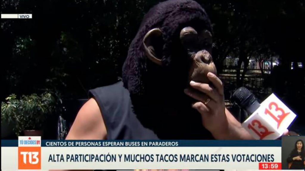 Durante toda la jornada electoral se han replicado las denuncias por la falta de transporte y de Maipú se produjo una bastante especial. Un elector llegó a ejercer su deber cívico con una mascara de primate y manifestó su descontento con todo lo ocurrido en estas elecciones.