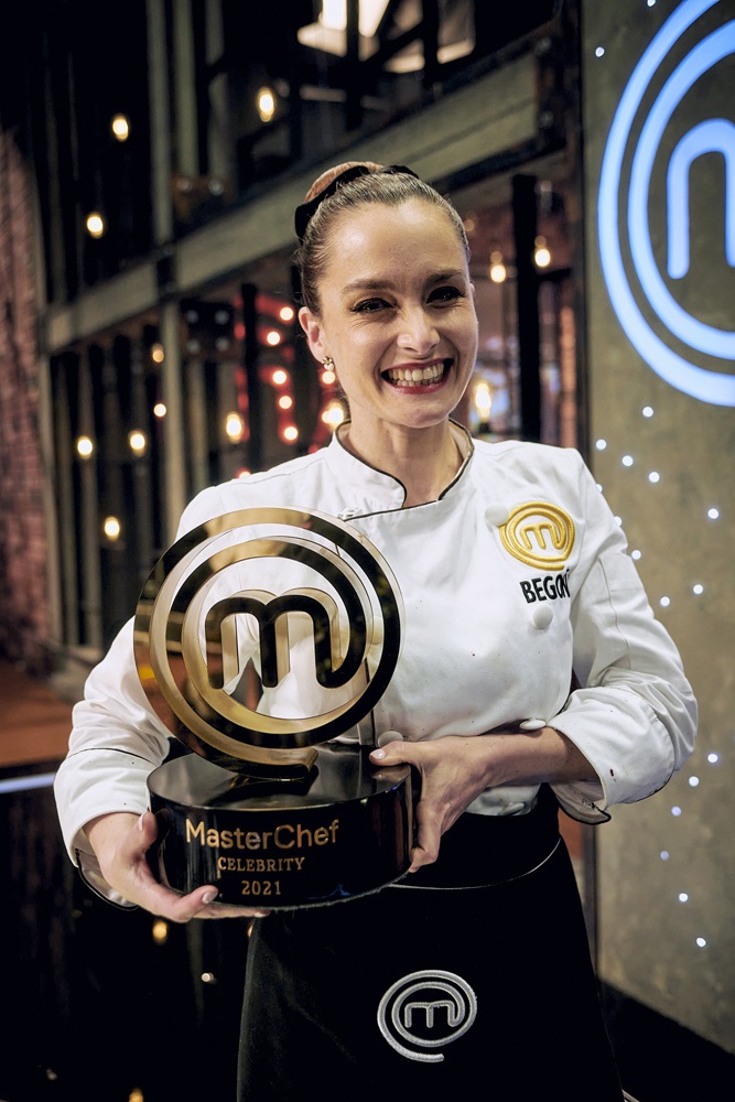 Momentos de gran alegría, felicitada por sus compañeros y abrazada por los tres chefs, Begoña toma en sus manos el clásico trofeo de “MasterChef Celebrity” que la convierte en la mejor cocinera de la temporada 2021 y ganadora de 25 millones de pesos.