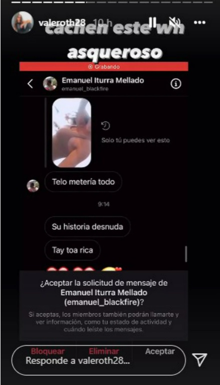Según evidenció Vale Roth, el usuario en cuestión no solamente le enviaba mensajes subidos de tono, sino también fotos de sus partes íntimas. En los pantallazos que expuso la gimnasta, se ve como le pide que se desnude