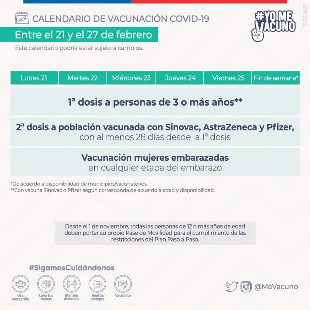 - Lunes 21: 1era dosis a personas de 3 o más años / 2da dosis a población vacunada con Sinovac, AstraZeneca y Pfizer, con el menos 28 días desde la 1era dosis / Vacunación mujeres embarazadas a partir de las 16 semanas de edad gestacional