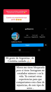 El denunciado es Guillermo Penna según indicó Flavia Medina, su «estafador número 1 en la vida». Incluso advirtió a sus seguidores de Córdoba, ya que el hombre estaría viviendo allá.