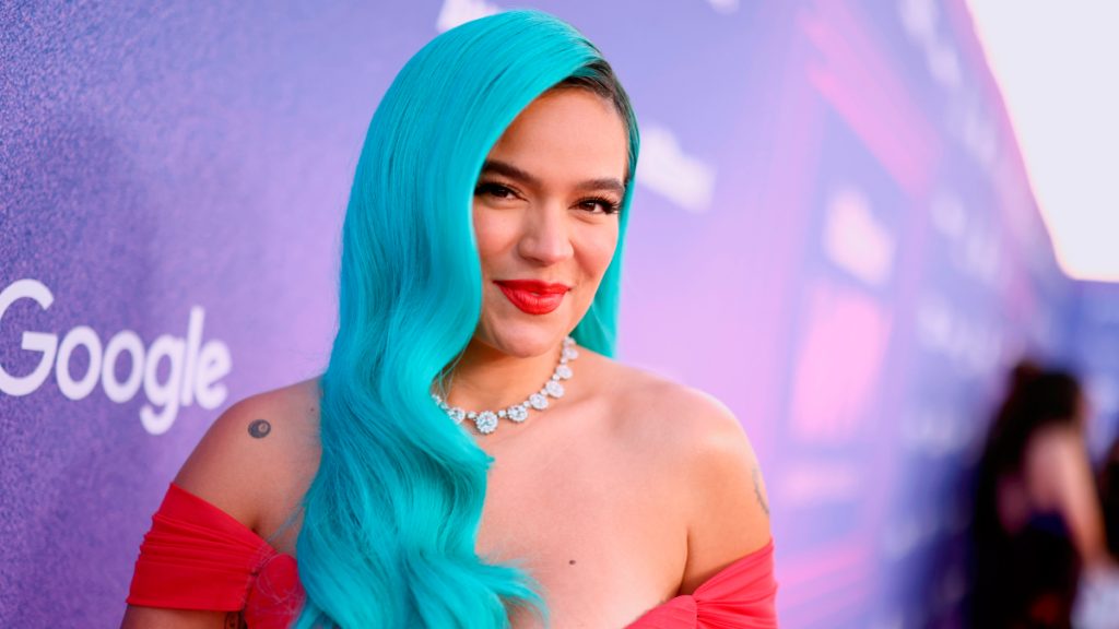 En la primera postal, Karol G aparece dando la espalda a la cámara y su pelo verde adornado con una flor silvestre, cubre toda la parte de su espalda, sin embargo, deja poco a la imaginación.