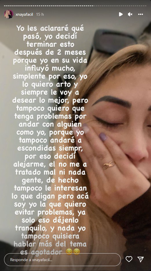 Asimismo, continuó explicando porqué decidió terminar su relación con su pinche. «Yo decidí terminar esto después de 2 meses porque yo en su vida, influyó mucho. Simplemente por esto, yo lo quiero harto y siempre le voy a desear lo mejor», señaló Naya Fácil.