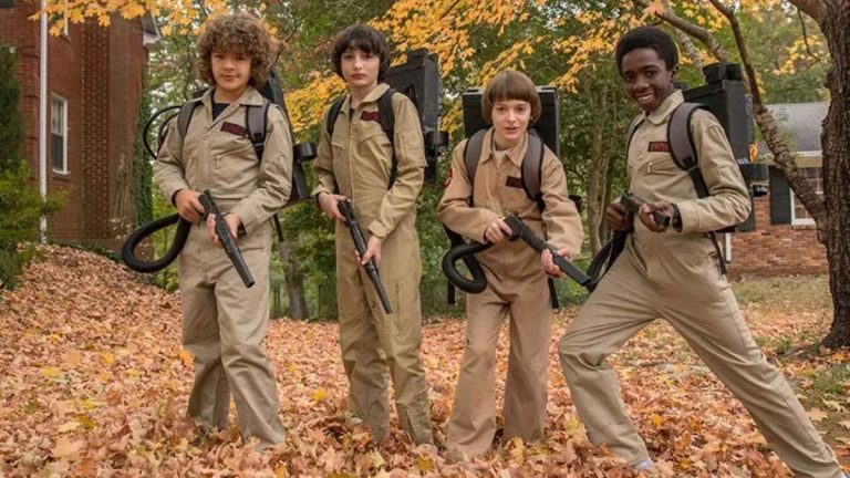 Will (Noah Schnapp), Dustin (Gaten Mattarazzo), Mike (Finn Wolfhard) y Lucas (Caleb McLaughlin) se disfrazan de los Cazafantasmas y posan para las fotos de sus progenitores.