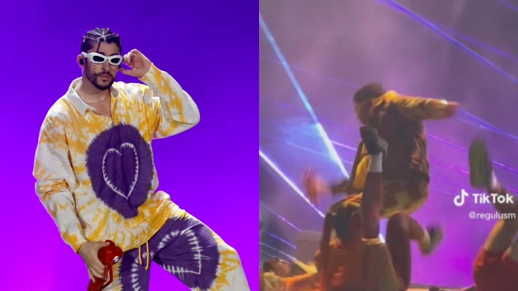 En el registro viral se puede ver como los bailarines siguen realizando la coreografía de la canción. Esto al mismo tiempo que Bad Bunny se cruzó de brazos y después procedió a tomar su micrófono que se desarmó durante la caída.