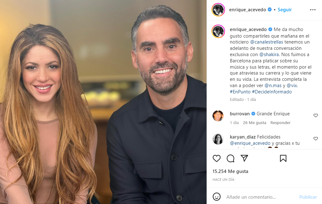 «Me da mucho gusto compartirles que mañana en el noticiero @canalestrellas tenemos un adelanto de nuestra conversación exclusiva con @shakira. Para platicar sobre su música y sus letras, el momento por el que atraviesa su carrera y lo que viene en su vida», relató.