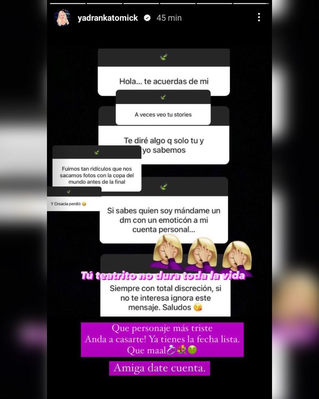 «Hola… te acuerdas de mi», «A veces veo tu stories», «Te diré algo q solo tu y yo sabemos», «Fuimos tan ridículos que nos sacamos fotos con la copa del mundo antes de la final», «Y Croacia perdió», «si sabes quien soy mándame un dm con un emoticón a mi cuenta personal…», «siempre con total discreción, sino te interesa este mensaje. Saludos», fueron parte de los mensajes que reveló Yadranka Tomic.