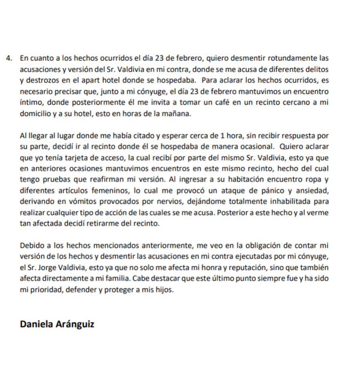Para cerrar Daniela Aránguiz indica que «Debido a los hechos mencionados anteriormente, me veo en la obligación de contar mi versión de los hechos y desmentir las acusaciones en mi contra (…), esto ya que no solo afecta mi honra y reputación, sino que también afecta directamente a mi familia».