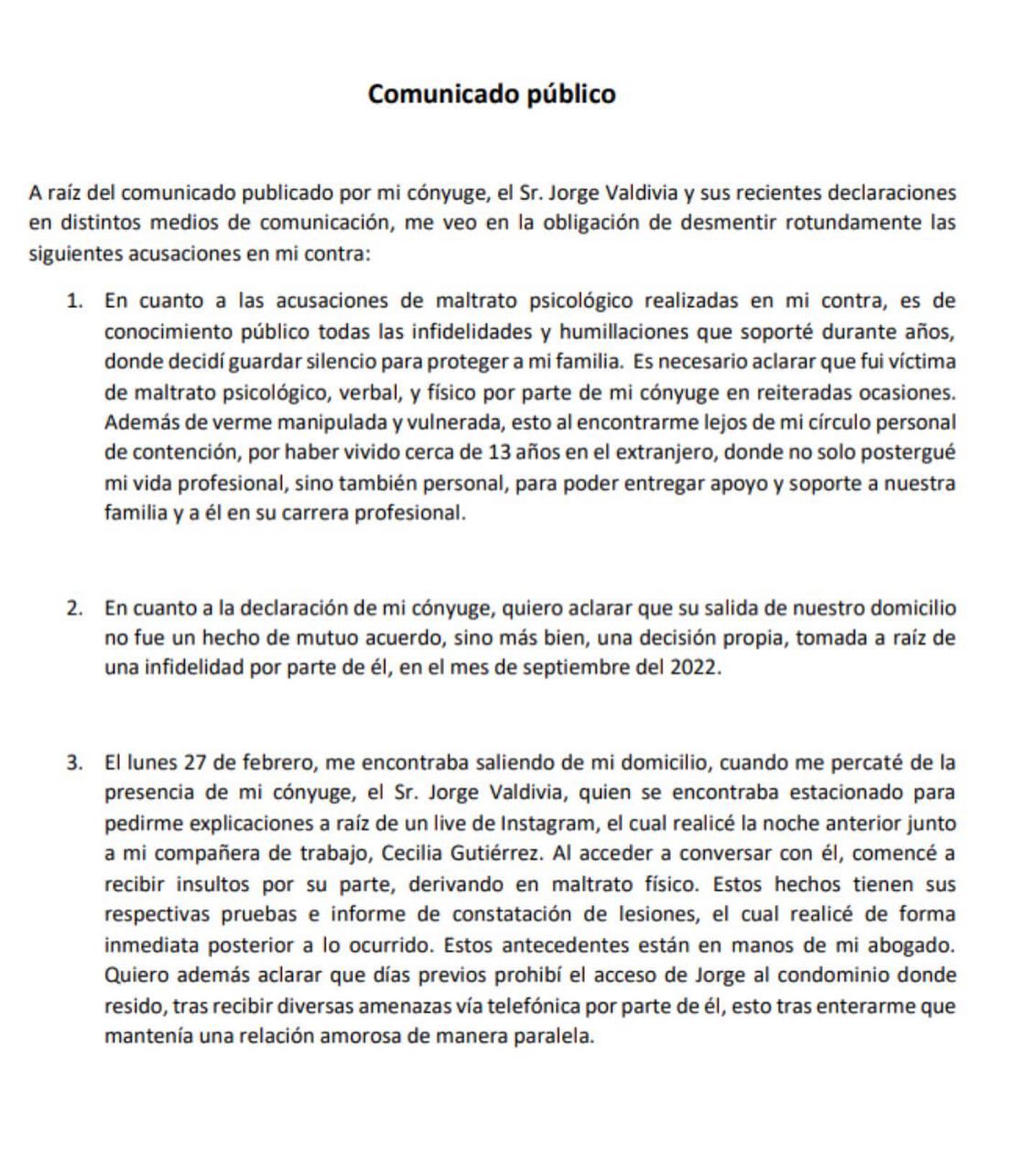 Para comenzar, indica que «En cuanto a las acusaciones de maltrato psicológico realizadas en mi contra, es de conocimiento público todas las infidelidades y humillaciones que soporté durante años, donde decidí guardar silencio para proteger a mi familia».