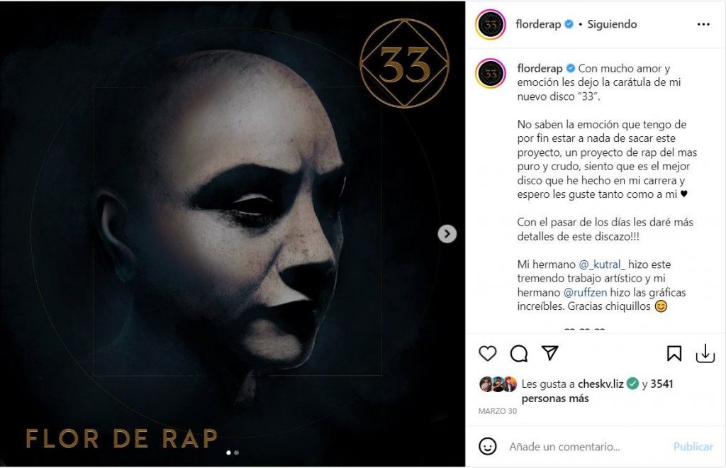 De esta forma, en conjunto a Warner Music, Flor de Rap estrenará su nuevo EP «33» este viernes 14 de abril y la artista no ha escondido su felicidad al respecto.