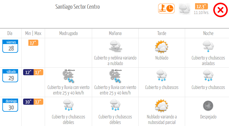 De acuerdo a esto, el día que caería más agua es el sábado, donde según ha informado la Dirección Meteorológica de Chile habrá un sistema frontal de lluvias acompañadas de fuertes vientos durante la mañana. Además las precipitaciones se extenderán durante todo el día.