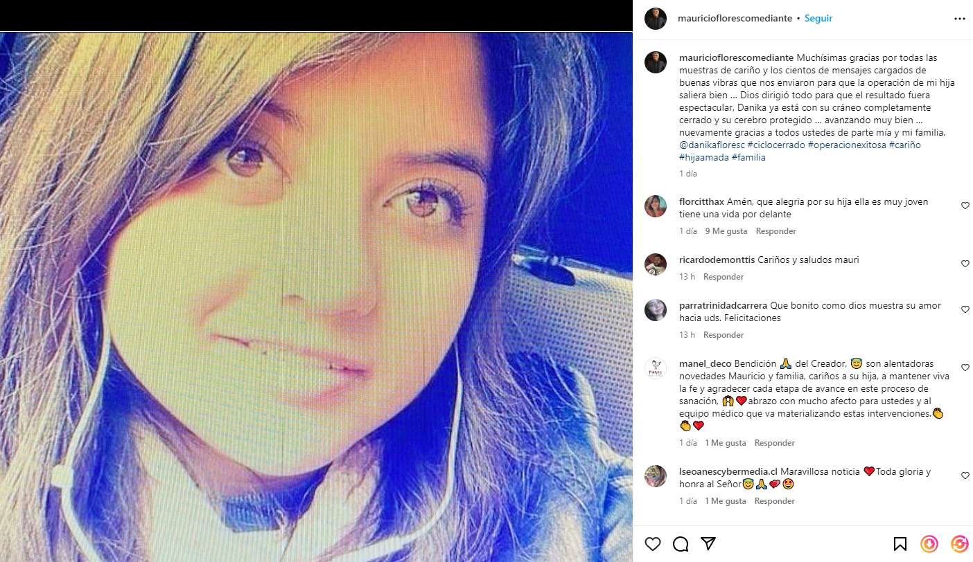 «Dios dirigió todo para que el resultado fuera espectacular, Danika ya está con su cráneo completamente cerrado y su cerebro protegido … Avanzando muy bien … Nuevamente, gracias a todos ustedes de parte mía y mi familia», mencionó Mauricio Flores.