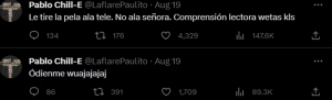 Dicho esto, tras nombrar a la participante del encierro, el algoritmo de Twitter hizo lo suyo e hizo que le apareciera constantemente contenido de Gran Hermano Chile, situación que no le ha causado ninguna gracia a Pablo Chill-E, según consigna Publimetro.