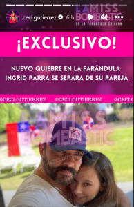 Así lo anunció Cecilia Gutiérrez a través de las historias en sus redes sociales: «Nuevo quiebre en la farándula. Ingrid Parra se separó de su pareja«.