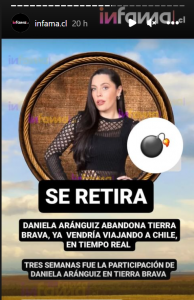 «Se retira (…) Daniela Aránguiz abandona Tierra Brava. Ya vendría viajando a Chile, en tiempo real. Tres semanas fue la participación de Daniela Aránguiz en Tierra Brava», revelaron desde el citado medio.