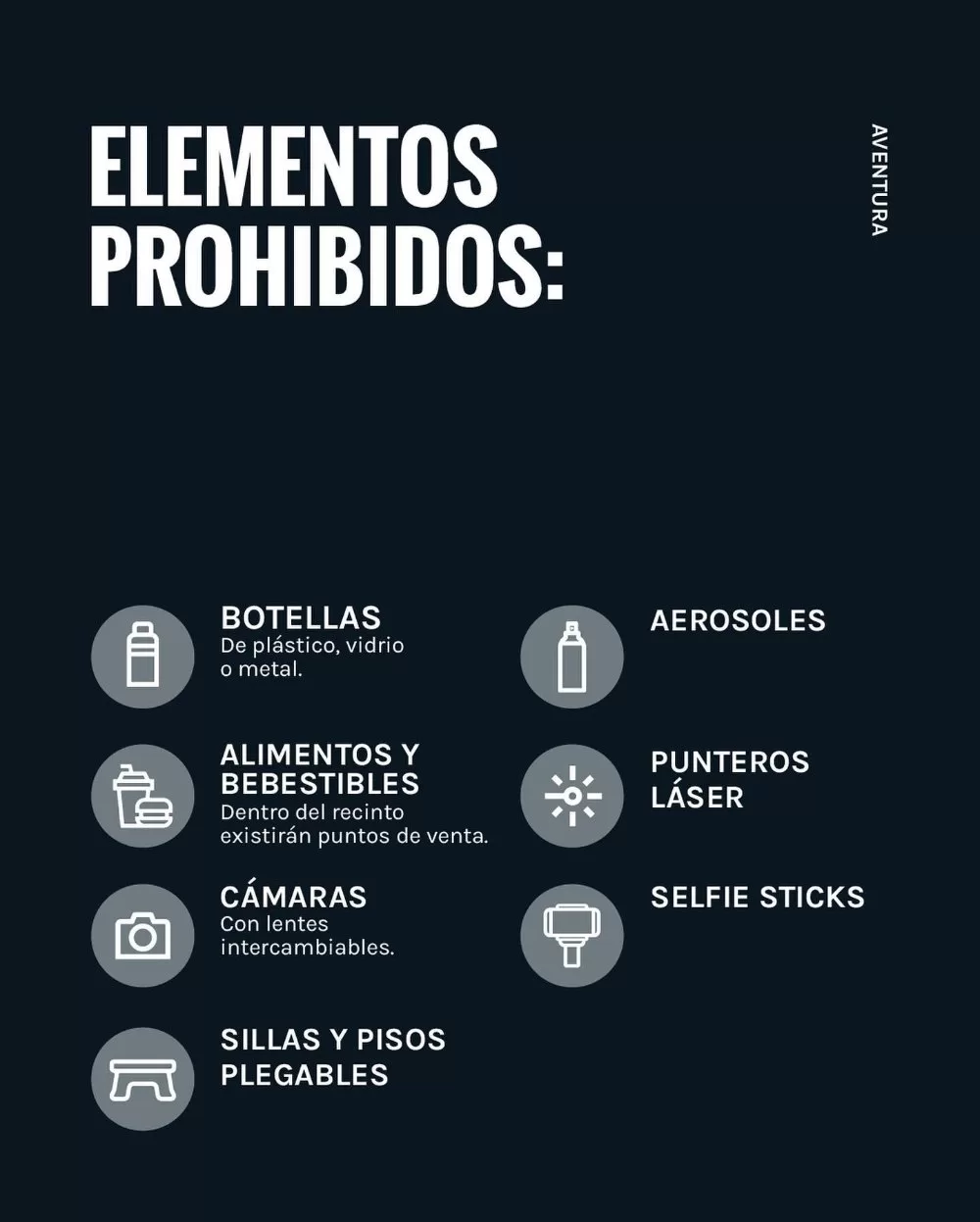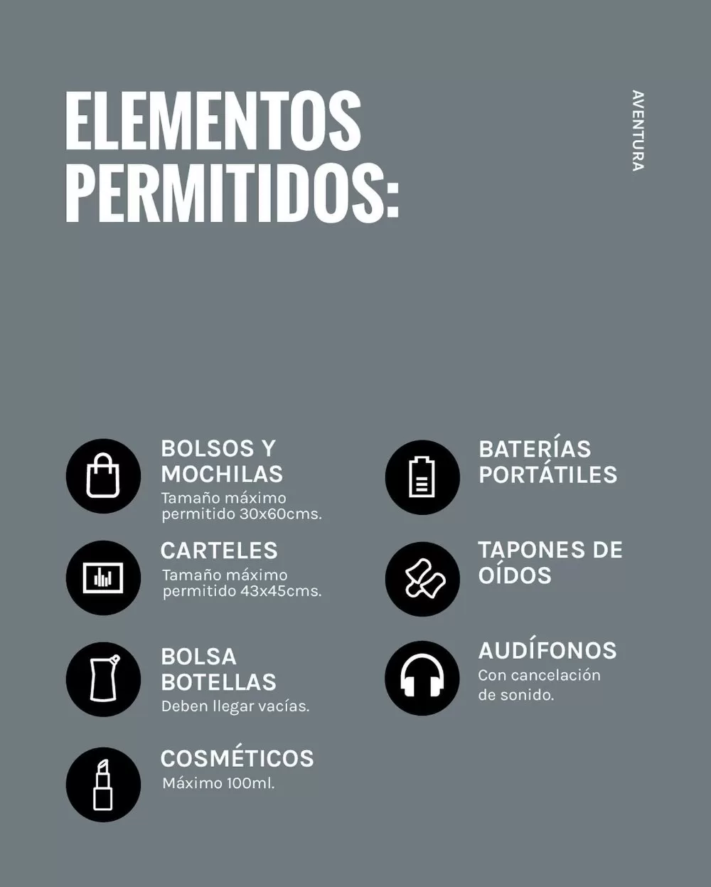 Además, desde la productora DG Medios también informaron los objetos que estarán permitidos y los que estarán prohibidos para los conciertos de Aventura en Chile. A continuación te dejamos las listas: