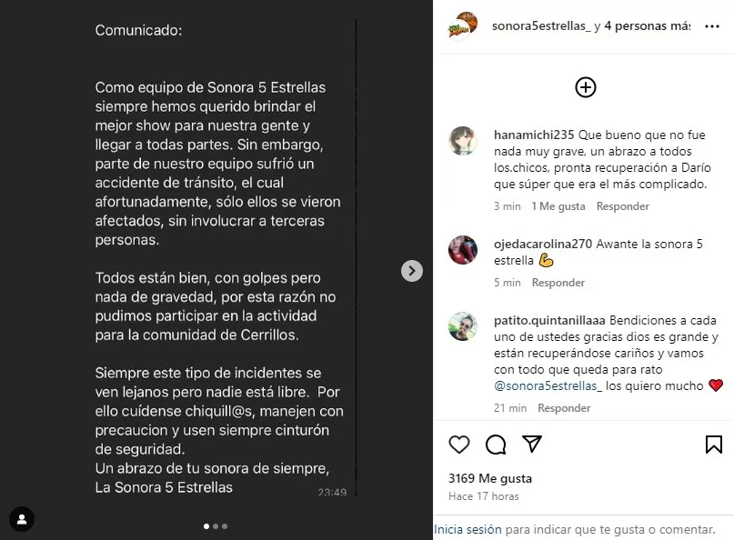«Como equipo de Sonora 5 Estrellas siempre hemos querido brindar el mejor show para nuestra gente y llegar a todas partes. Sin embargo, parte de nuestro equipo sufrió accidente de tránsito, el cual, afortunadamente, solo ellos se vieron afectados, sin involucrar a terceras personas», indicaron.