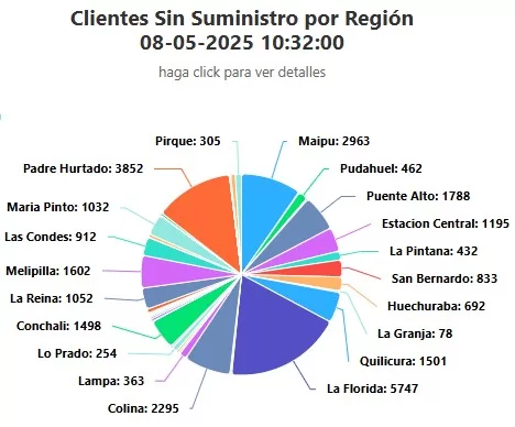 Las comunas de Santiago que se han visto más afectadas por cortes de luz son La Florida (5.747 clientes sin luz), Padre Hurtado (3.852 clientes sin luz), Maipú (2.963 clientes sin luz) y Colina (2.295 clientes sin luz).