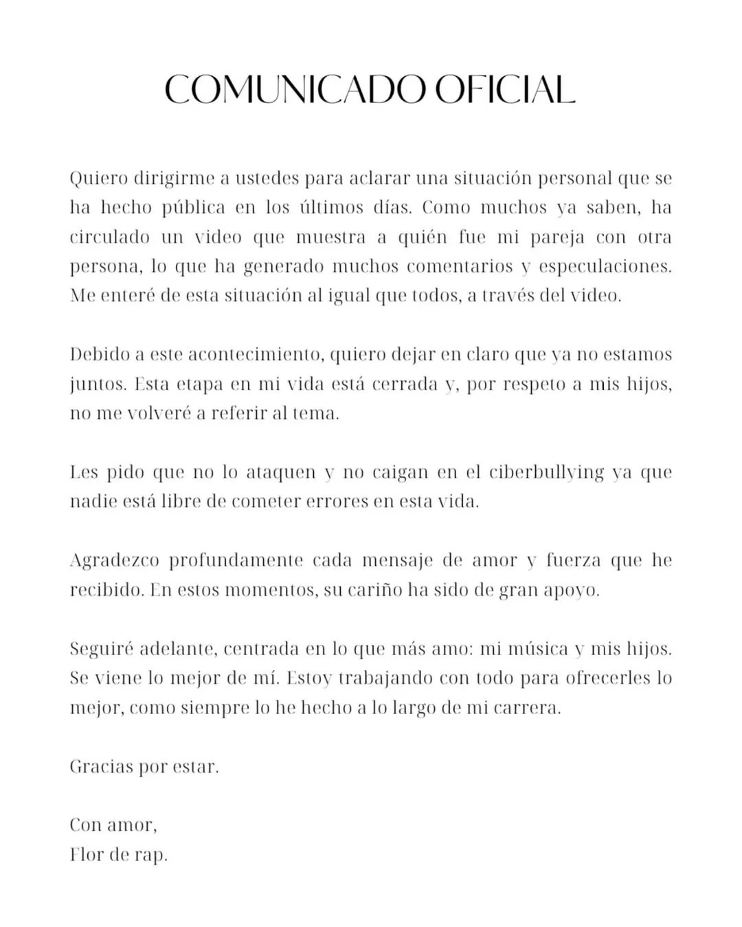 «Quiero dirigirme a ustedes para aclarar una situación personal que se ha hecho pública en los últimos días. Como muchos ya saben, ha circulado un video que muestra a quién fue mi pareja con otra persona. Lo que ha generado muchos comentarios y especulaciones», comenzó señalando Flor de Rap.