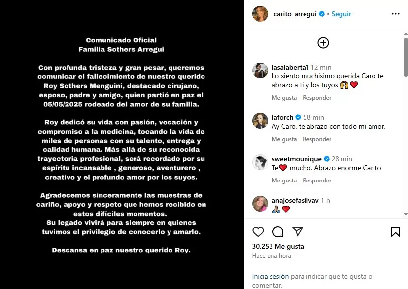 Luego de se conoció la lamentable partida del médico, Carolina Arregui compartió en su Instagram un comunicado a nombre de la familia.