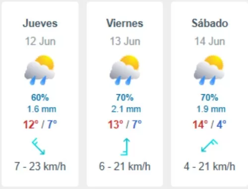 Además, según el pronóstico del tiempo en Santiago de Metoered, en el transcurso del viernes 6 de junio, la máxima llegaría a 18 grados y la mínima de 8 grados.