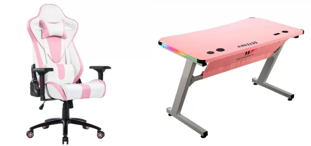 - Un set gamer rosado enfocado a las girlies. Este incluye un escritorio y silla gamer que son cortesía de Central Gamer.