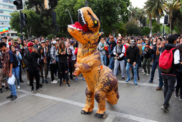 25 octubre, 2020 Así fue la acontecida participación de “Corre Dinosaurio” en esta jornada de votación “Corre Dinosaurio”, conocido por su participación en las manifestaciones del estallido social, volvió a aparecer con su clásico disfraz