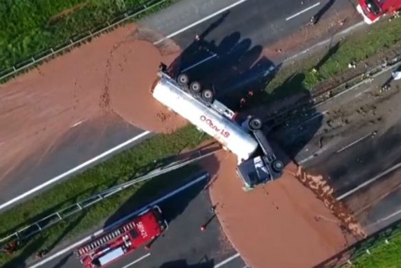 14 mayo, 2018 Pegajoso desastre: miles de litros de chocolate quedan esparcidos en una autopista de Polonia